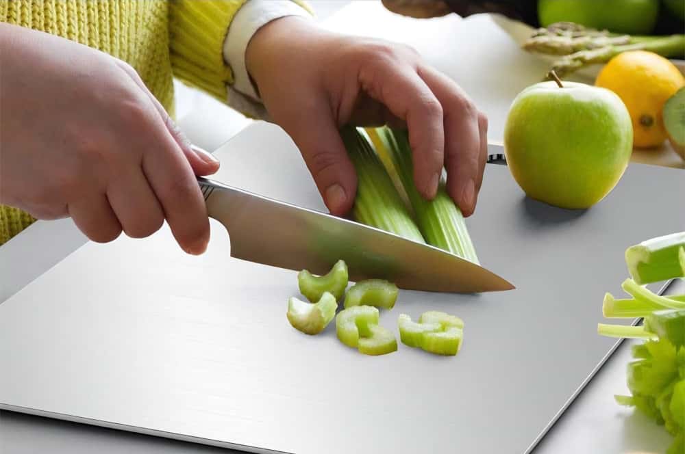 No more than a quality wood board would. It’s designed to be knife-friendly, unlike glass or cheap steel surfaces. Many customers actually say their knives feel sharper longer because the surface doesn’t chip or fight back.